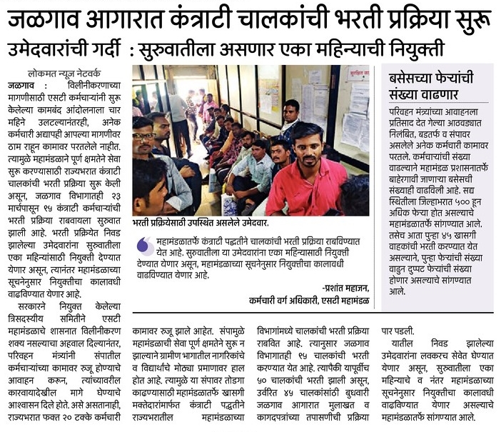 विलीनीकरणाच्या मागणीसाठी एसटी कर्मचाऱ्यांनी सुरु केलेल्या कामबंद आंदोलनाला चार महिने उलटल्यानंतरही, अनेक कर्मचारी अद्यापही आपल्या मागणीवर ठाम राहून कामावर परतलेले नाहीत. त्यामुळे महामंडळाने पूर्ण क्षमतेने सेवा सुरु करण्यासाठी राज्यभरात कंत्राटी चालकांची भरती प्रक्रिया सुरु केली असून, जळगाव विभागातही २३ मार्चपासून ९५ कंत्राटी कर्मचाऱ्यांची भरती प्रक्रिया राबवायला सुरुवात झाली आहे.